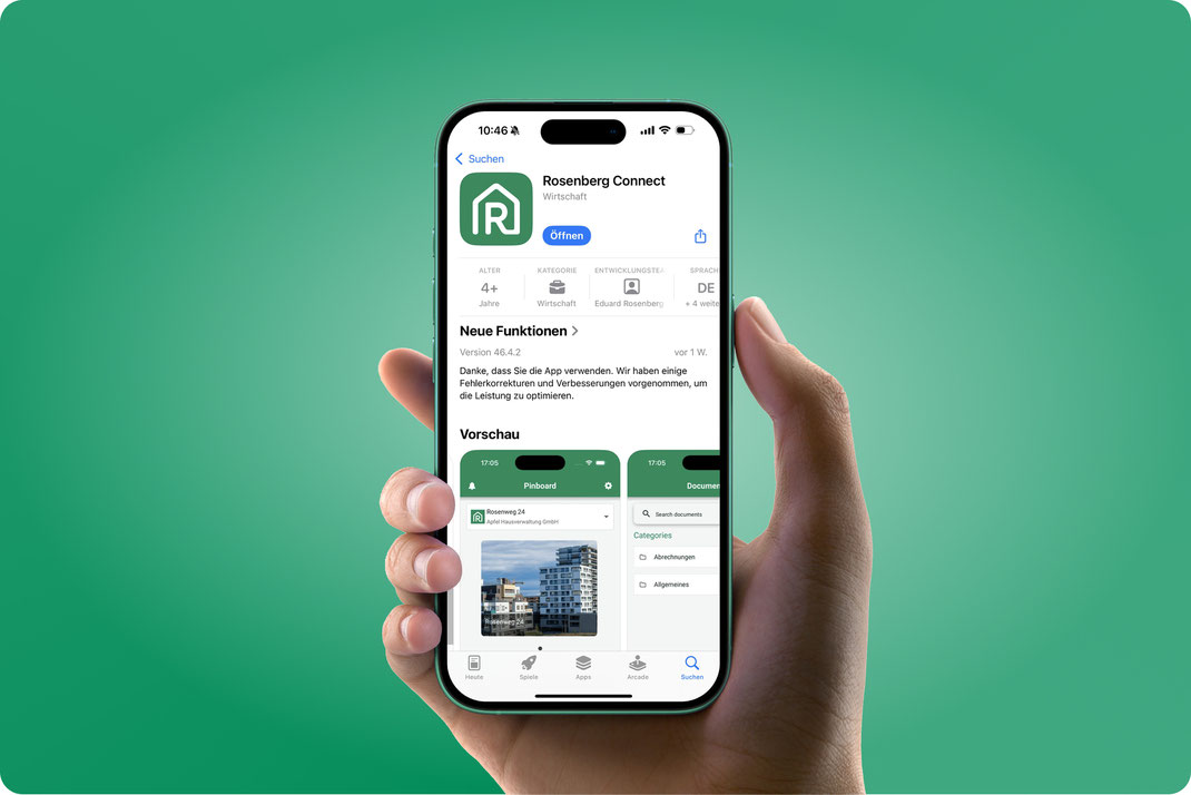 Ob Schadensmeldung mit Fotos, Benachrichtigungen zu wichtigen Mitteilungen oder der Austausch mit Hausmeister und Verwaltung: Mit Rosenberg Connect bleibt alles rund ums Wohnen jederzeit transparent und griffbereit, direkt auf Ihrem Smartphone oder im Webbrowser.